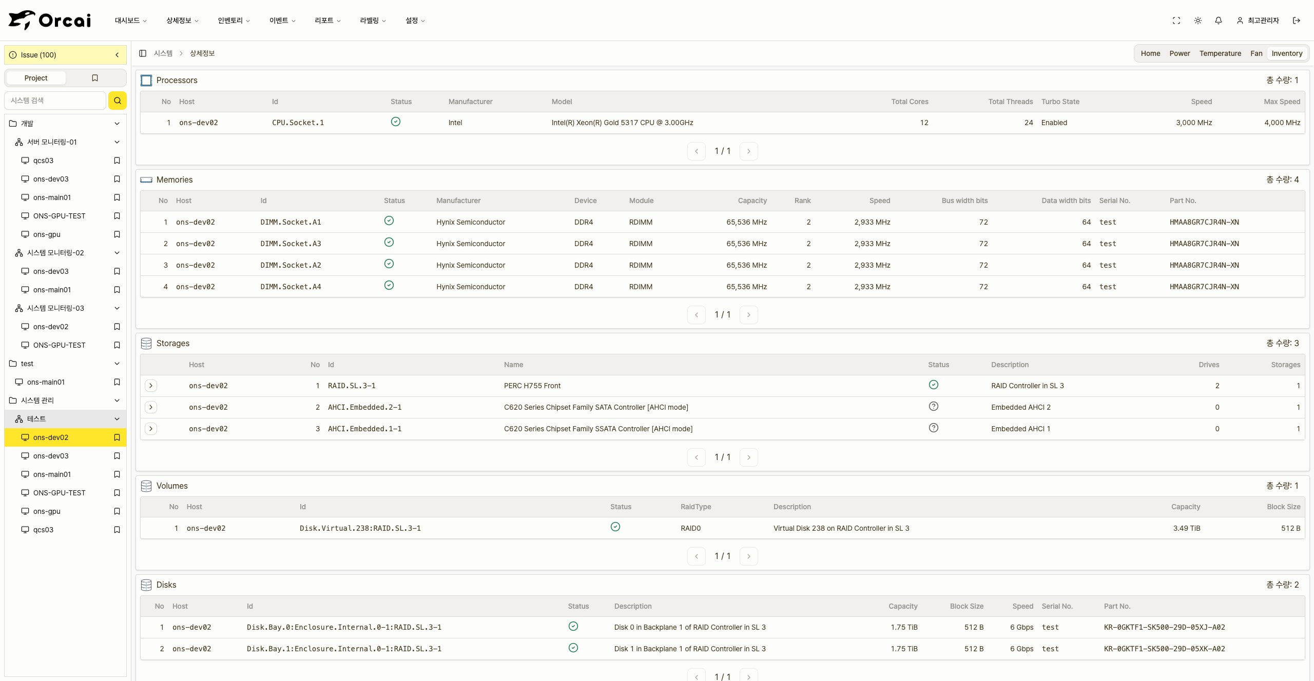 제조사별, 모델별, 파트별 하드웨어의 제원을 확인하고 현재 상태를 실시간으로 감지