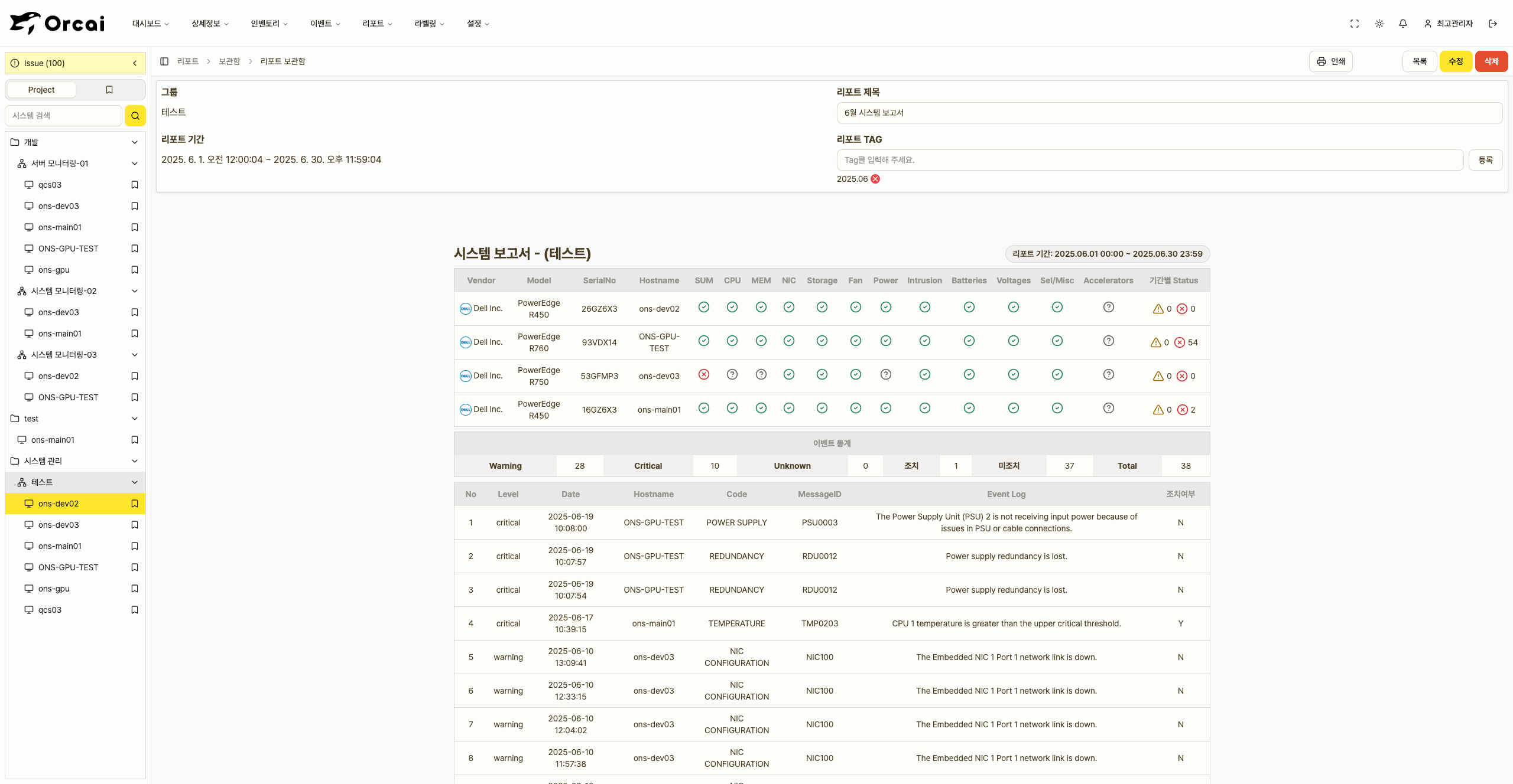 기간별, 모델별로 센서 데이터 통계, 로그 발생 내용과 파트 장애 내역을 정리하여 확인. 하드웨어 맞춤형 리포트